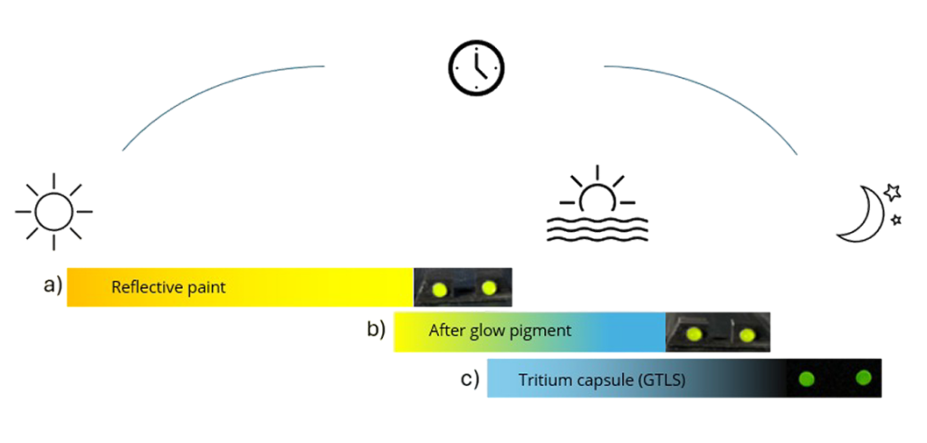 Once darkness sets in, technology b) fades out, the tritium light source c) with a stored long-term energy takes over the job of illumination. Its technology lasts for years. At dawn, or with artificial light present, the cycle starts again.